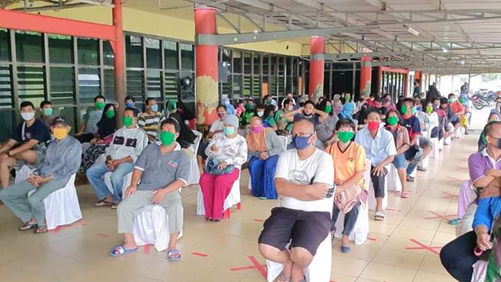 Warga yang hadir terlihat cukup tertib mengantre dan mengikuti protokol Covid-19, seperti memakai masker, tetap menjaga jarak dan cuci tangan terlebih dahulu sebelum masuk lokasi pasar murah.