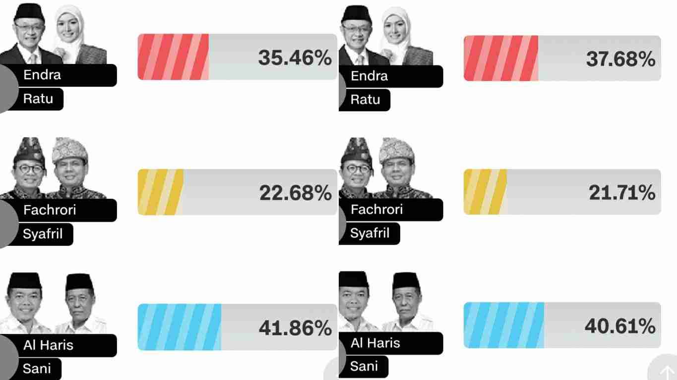 Sementara itu, dari hasil quick count Charta Politika Paslon 03 Al Haris-Sani unggul 39,86 persen, Paslon 01 CE-Ratu 38,09 persen dan Paslon 02 Fachrori-Syafril 22,05 persen.