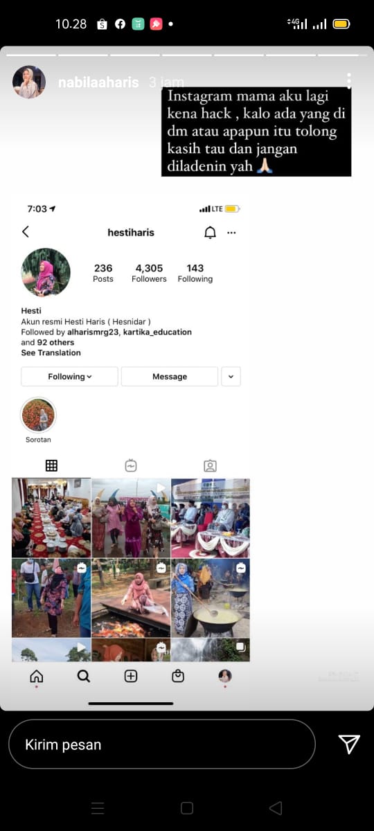Terkait akun IG pribadi Hesnidar Haris diretas, juga dibenarkan anak bungsunya, Nabila. Melalui cerita akun Instagram pribadinya, putri bungsu Hesnidar Haris ini menyebutkan Instragram ibunya di hacker.