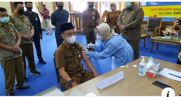 Pj Sekrestaris Daerah Kota Sungai Penuh Alpian menjadi orang pertama yang menerima vaksin. Lalu kemudian diikuti oleh Waka Polres dan jajaran Forkopimda lainnya.