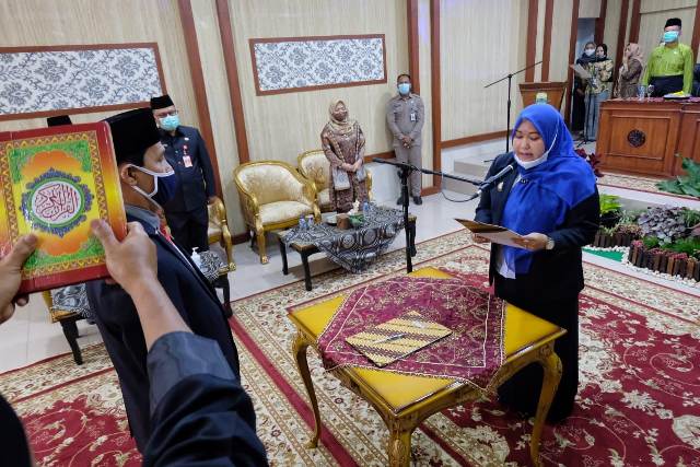 Dengan penerapan Protokol Kesehatan (Prokes), Bupati melantik Sekda Muaro Jambi. Bupati memandu Pj Sekda untuk mengucapkan sumpah jabatan hingga penandatangan fakta integritas.