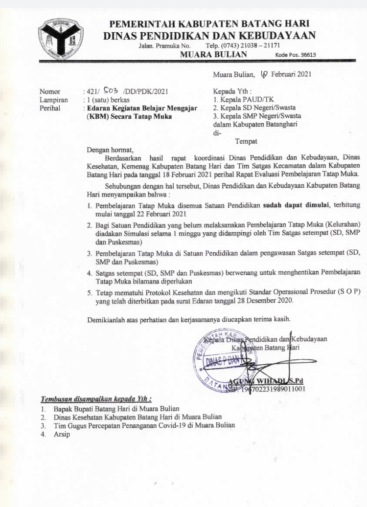 “Tembusan surat edaran KBM tatap muka disampaikan kepada Bupati Batanghari, Dinas Kesehatan, Tim Satgas COVID-19 dan arsip,” katanya.(***)