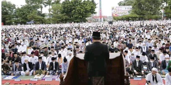Jambipers,com, Sungai Penuh – Wali Kota Sungai Penuh, Ahmadi Zubir dan Wakil Wali Kota Alvia Santoni melaksanakan Shalat Idul Fitri 1443 H di Lapangan Mardeka, Senin (2/5/2022). Ribuan umat Islam terlihat sangat antusias mengikuti Shalat Ied 1443 H di tempat tersebut. Pasalnya, di lokasi ini sudah dua tahun tidak dilaksanakan Shalat Ied akibat Covid-19.